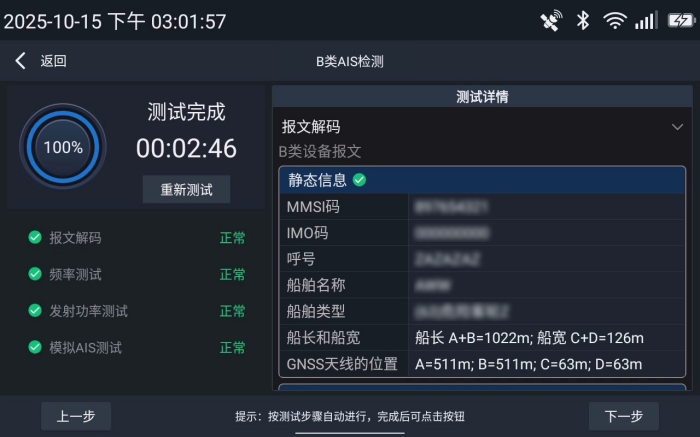 发射及接收检测:检测被测 AIS 的发射性能与接收灵敏度,判断其性能表现。